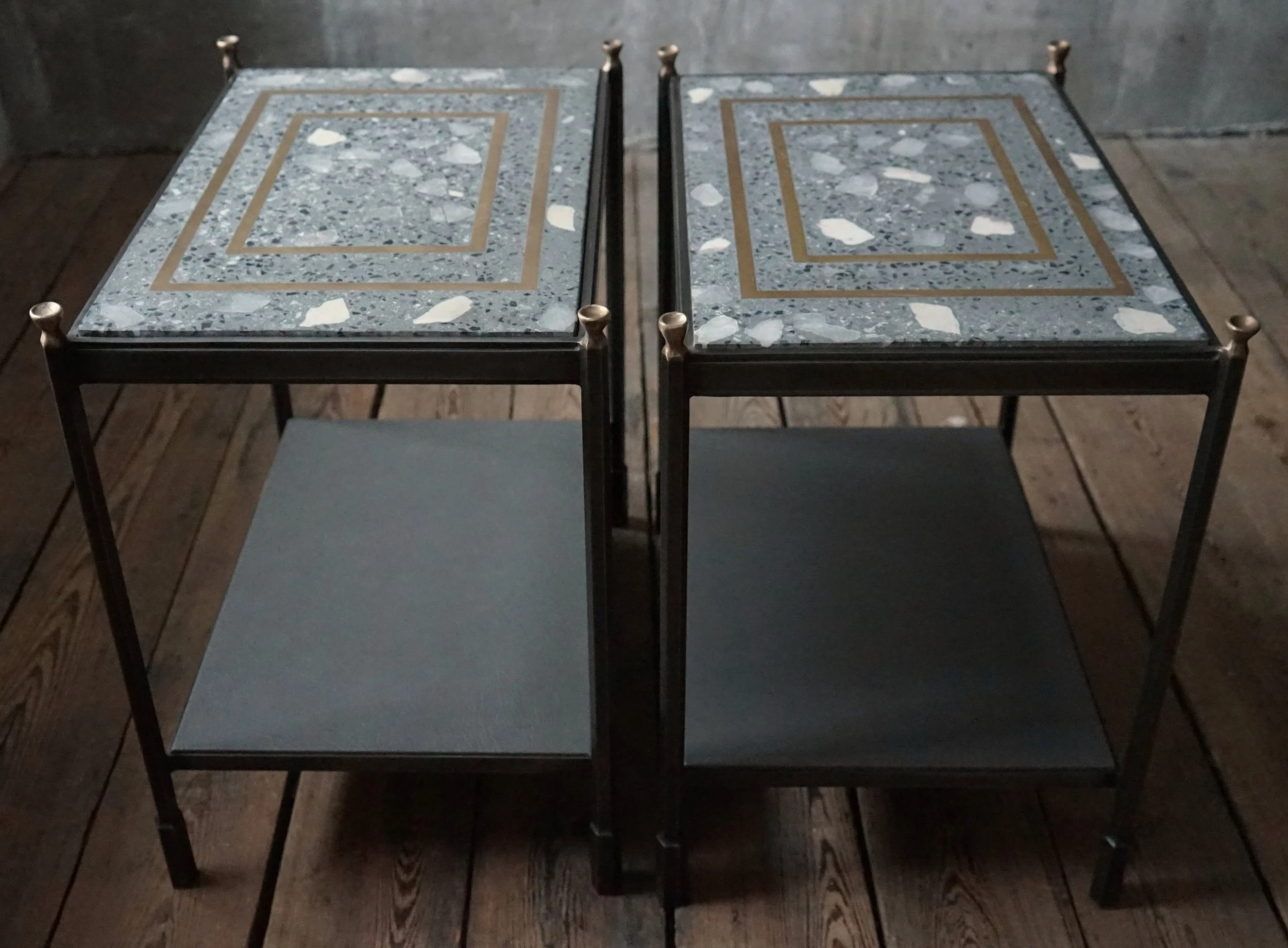 This table features a grey terrazzo top with Bluestone, Marble, and Alabaster pieces, accented by a rectangular brass inlay. The frame has hexagonal steel legs with bronze finials, finished in blackened steel rubbed back to a gunmetal look and sealed with a satin lacquer. The bottom shelf is upholstered in grey fabric and is customizable with COM upon request.