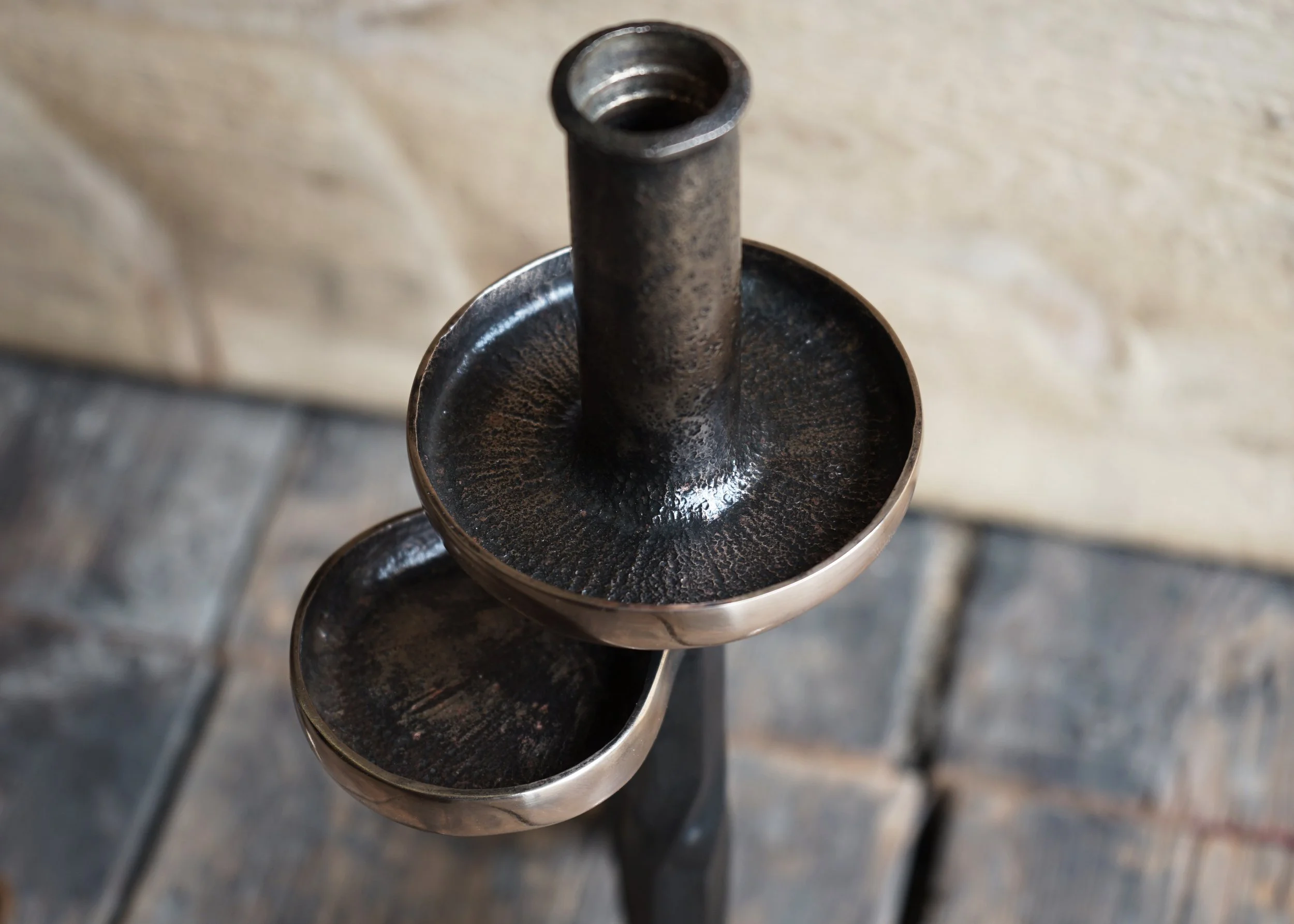 Designed for use with taper candles, the Penny three-legged candle holder is crafted from solid hexagonal steel, with bronze-tipped feet that converge at the center and extend upward, culminating in a bronze candle socket and bobeche.